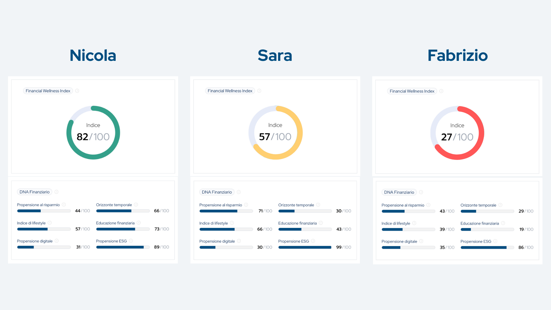 Il risultato è una visione a 360 gradi del cliente, che dà conto della sua situazione patrimoniale e, soprattutto, del suo Indice di Benessere Finanziario, che con il supporto offerto dalla piattaforma il consulente può aiutare a migliorare.