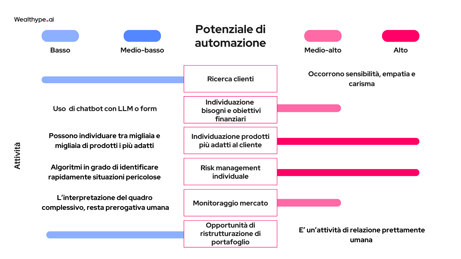 Laddove il potenziale d’automazione è elevato, ha senso automatizzare, ma dove è medio vi può essere supporto e potenziamento del consulente, si parla di “Augmentation”. Dove il potenziale è basso, l’automazione è inutile, forse anche dannosa.